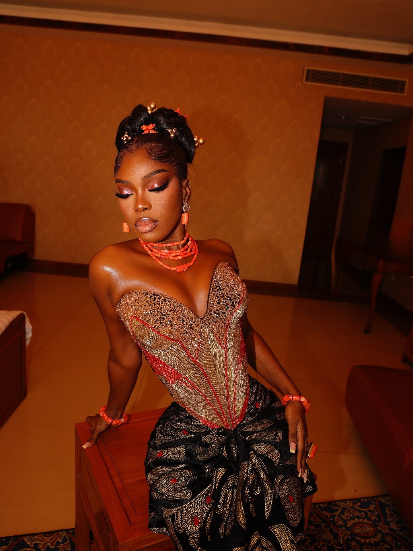 Lasosa is the designer behind this stunning Igbo traditional bridal look, and we must say it’s a complete masterpiece. The breathtaking armless ensemble features intricate red and golden beadings across the corset bust and a wrapped isi-agu skirt — you can agree it’s one fascinating look. Styled by Essa delivered a hairstyle so smoothly sleeked up into a high bun, decorated with coral and gold beads. Truly living up to the name, Glam by Omoye brought their A-game with this absolutely glamorous makeup: glowy, radiant and perfectly suited for a beautiful Igbo bride. We rate this look a solid 10! Your Igba-nkwu deserves this gorgeous look because it will definitely transform you into a radiant vision of pure bridal beauty.