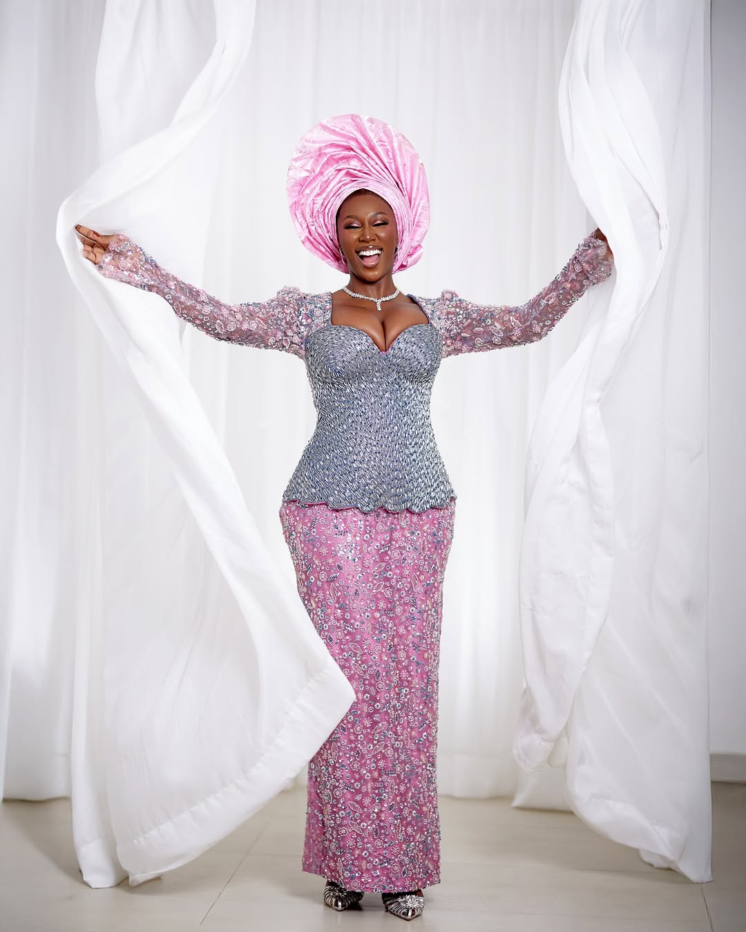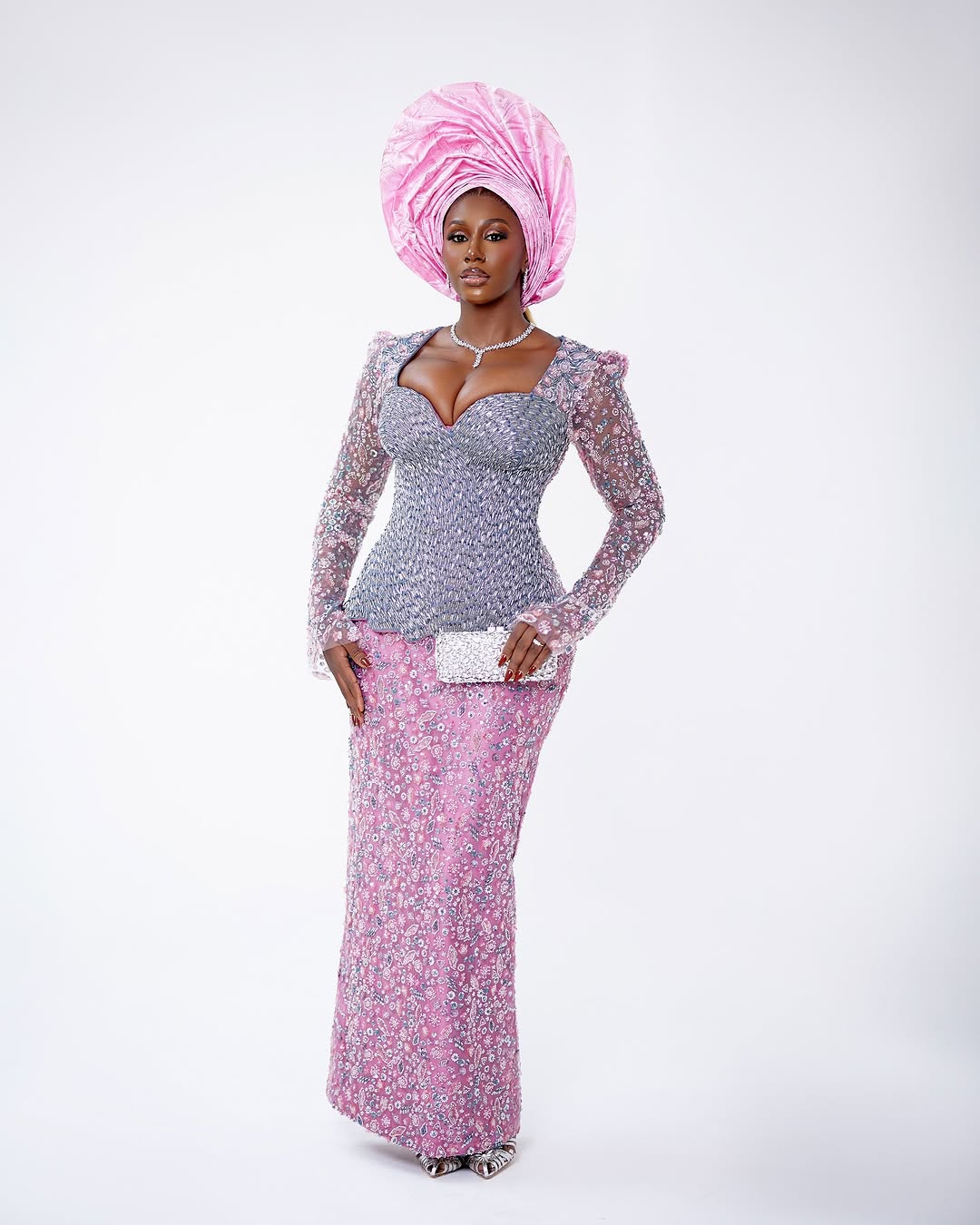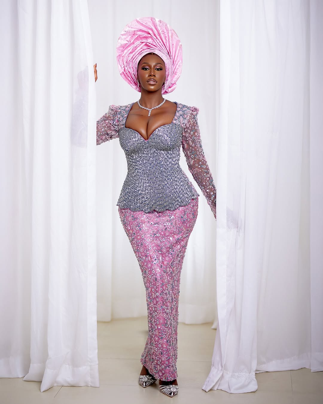 Radchaleur is the designer behind this stunning pink-blue dress, and it’s absolutely breathtaking. From the heavily beaded sweetheart corset to the sequined sleeves and fully embellished skirt, this look screams bridal perfection. Gele by Irawo stepped in with the traditional touch, delivered perfectly by this upright pink gele. The glamorous makeup? chef’s kiss! All thanks to Glow by Tia’s expert craftsmanship. Each detail merged perfectly together and brought this masterpiece to life in a beautiful way. Let us know what you think about this gorgeous look.
