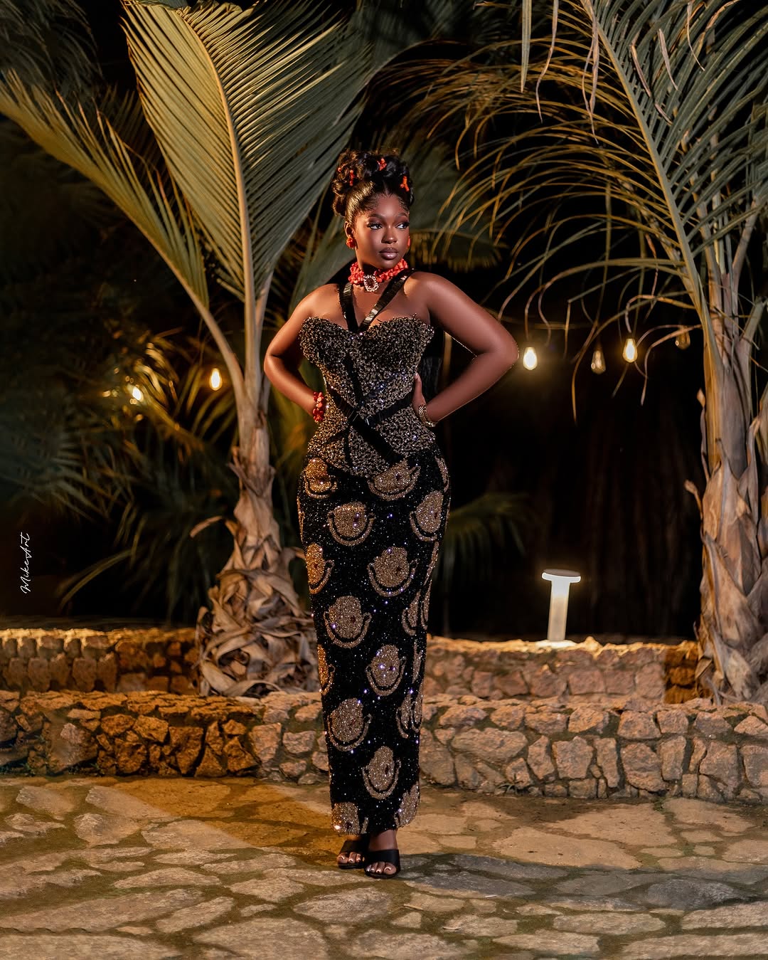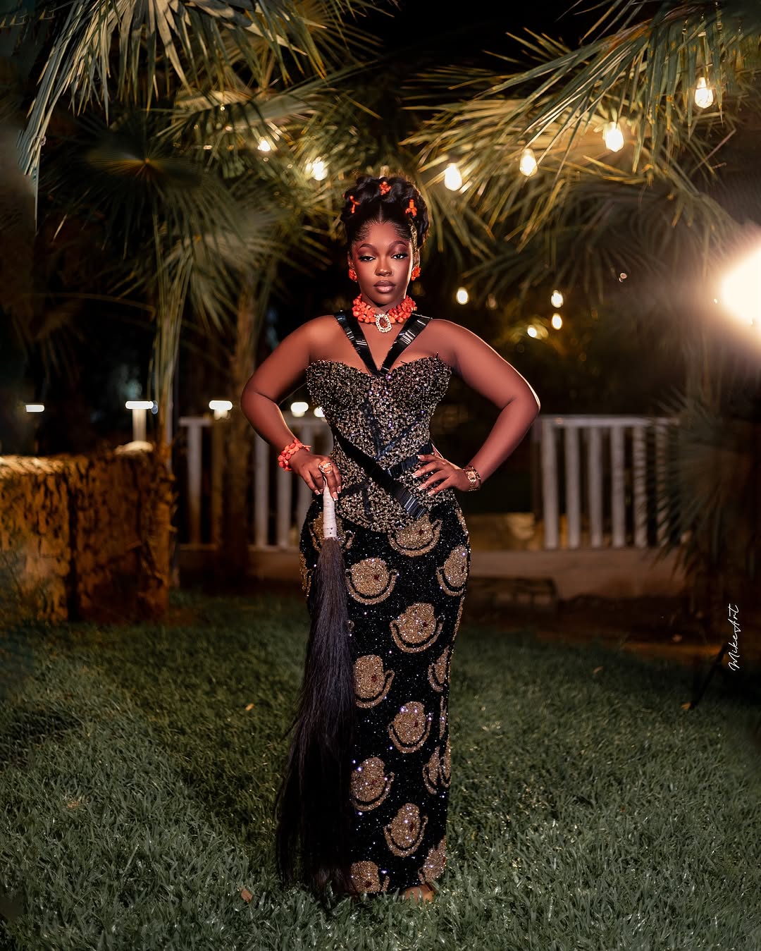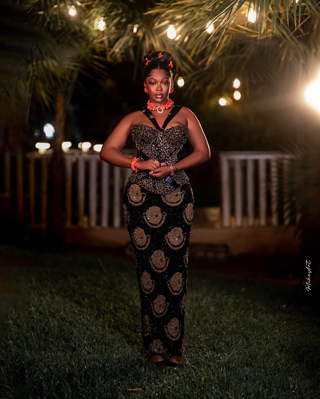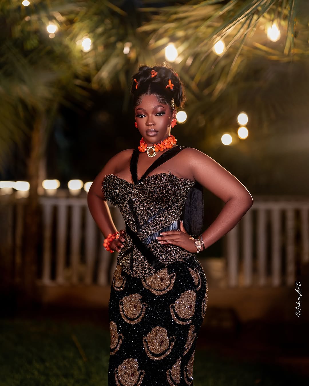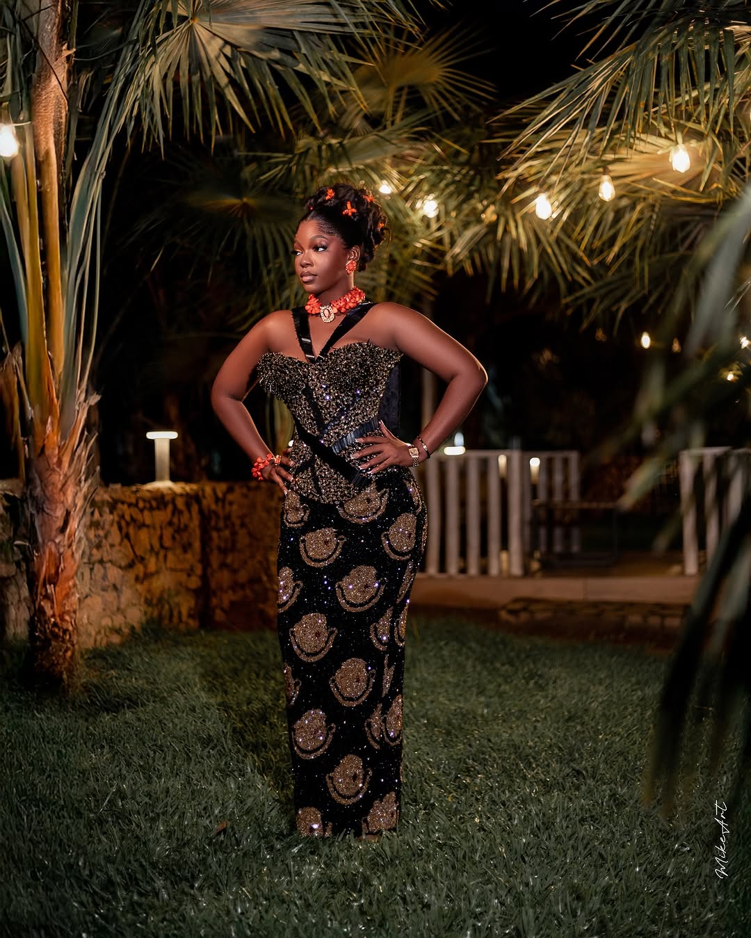 Courtesy of Kandice Official, this lovely black and gold fully beaded dress can be the look to bring you that dazzling effect you seek. The V-halter neckline down to the heavily beaded corset bodice, and the Isi-agu illusion beaded skirt, all harmonise into one glamorous ensemble. Excel Hair Lab did a wonderful job styling the hair up into a high curly bun, while Exotic Signatures created magic with this beautiful makeup look. This full ensemble is a unique approach to Igbo traditional bridal fashion, and we bet it has all it takes to give you a glow that never fades.