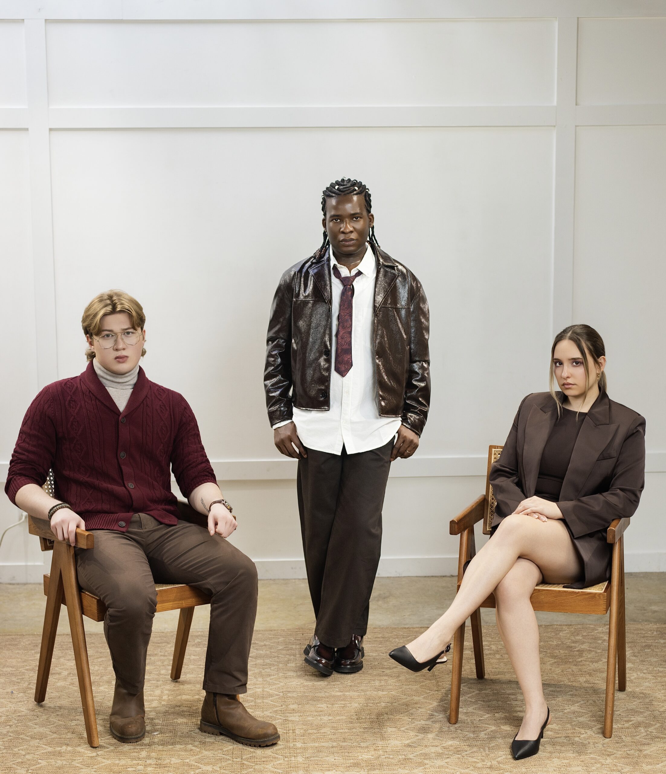 “Audiences should expect me to portray my character with the psychotic tendencies that he has. And to display his lack of caring for other people,” Albers says. Reflecting on the performances, Seyi describes the dynamic on set: “Marcel and Mauranda, in Job Seekers, were an especially powerful duo. Marcel came onto set with a very strong ‘dad’ energy, and by the end of the shoot, he was a different person.”