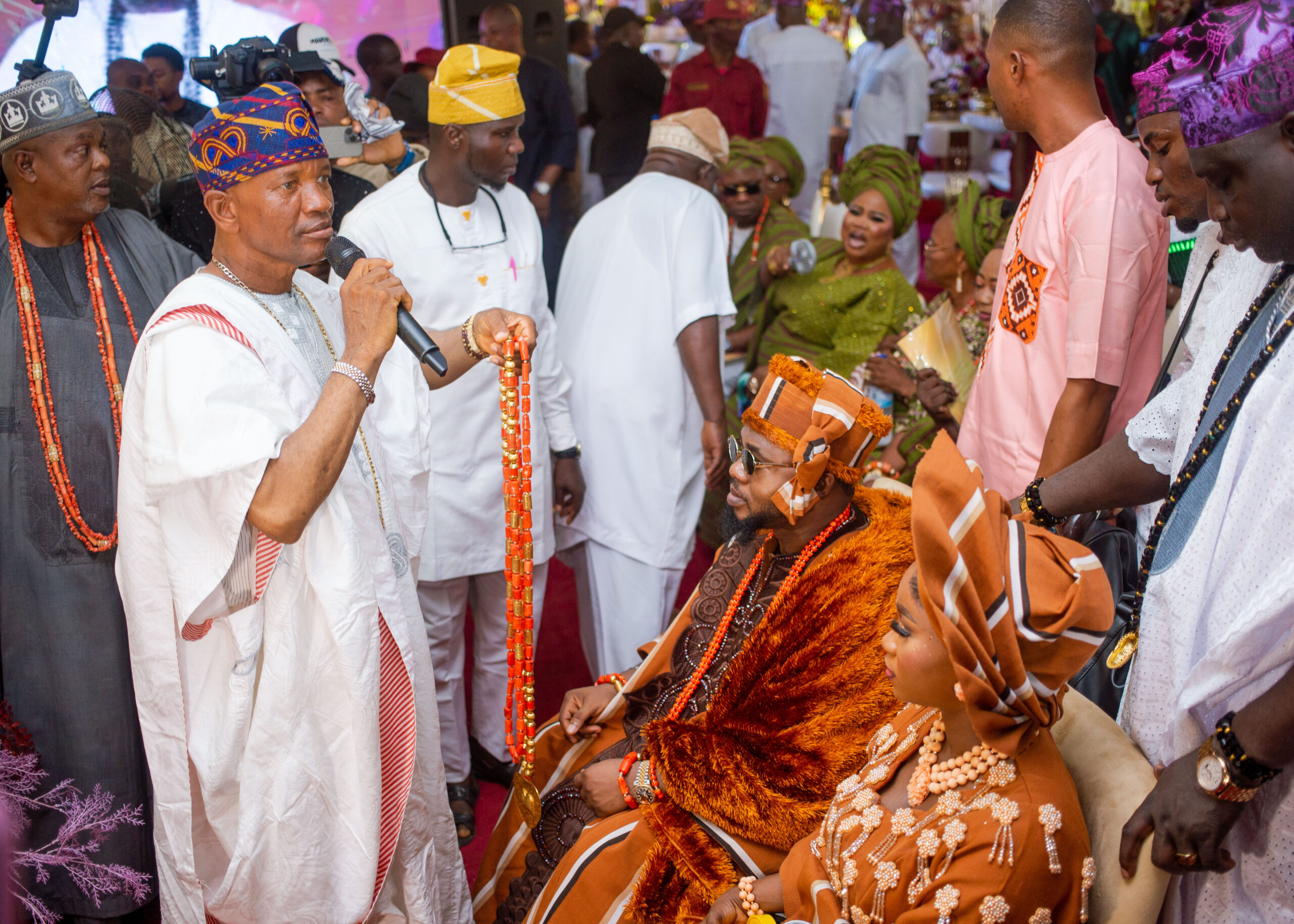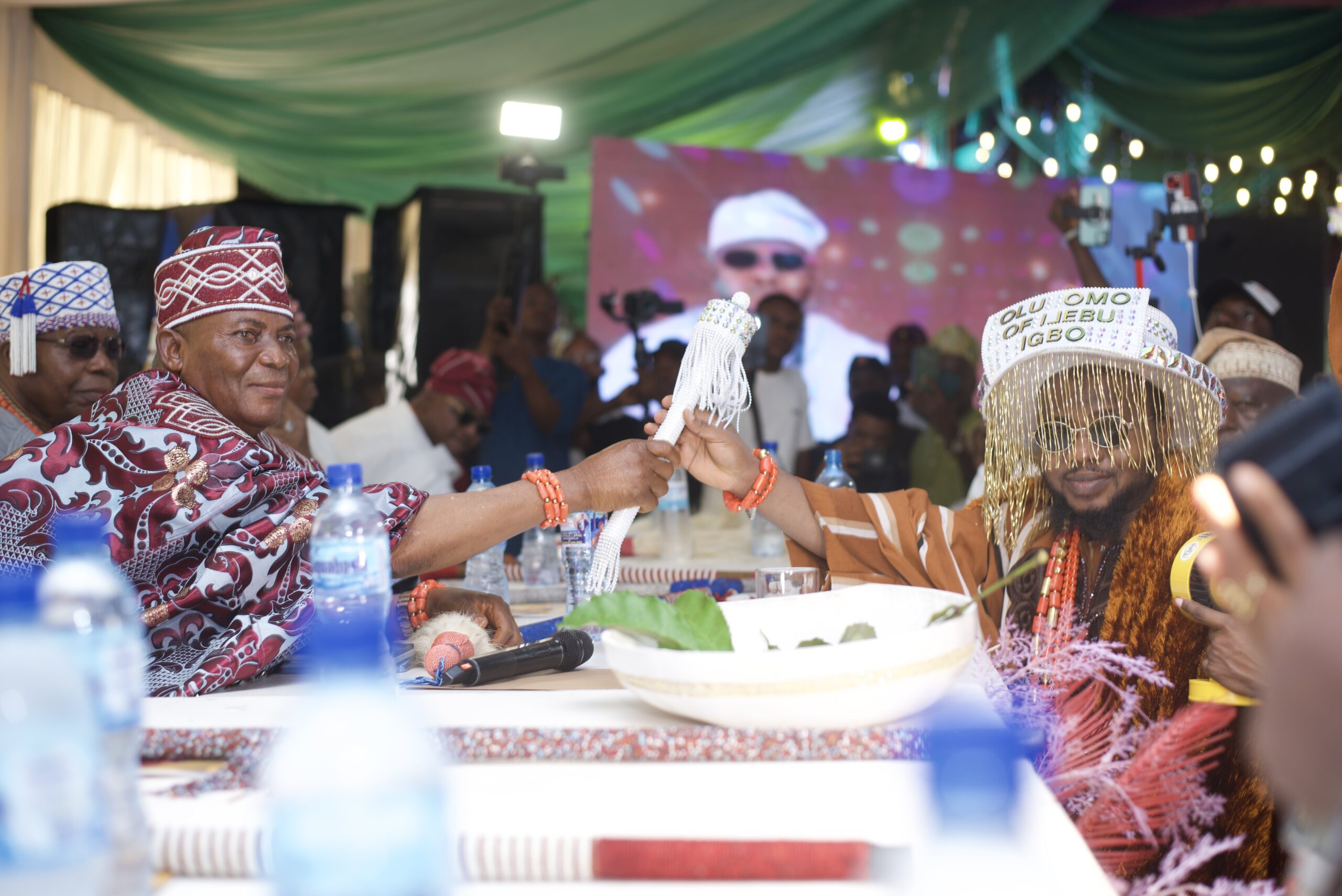 Abijaparako of Japara, Oba Abayomi Ogunye handing over the beads of office to Alhaji Lawal Abiodun Olawale, the new Oluomo of Ijebu Igbo, Ogun State.
